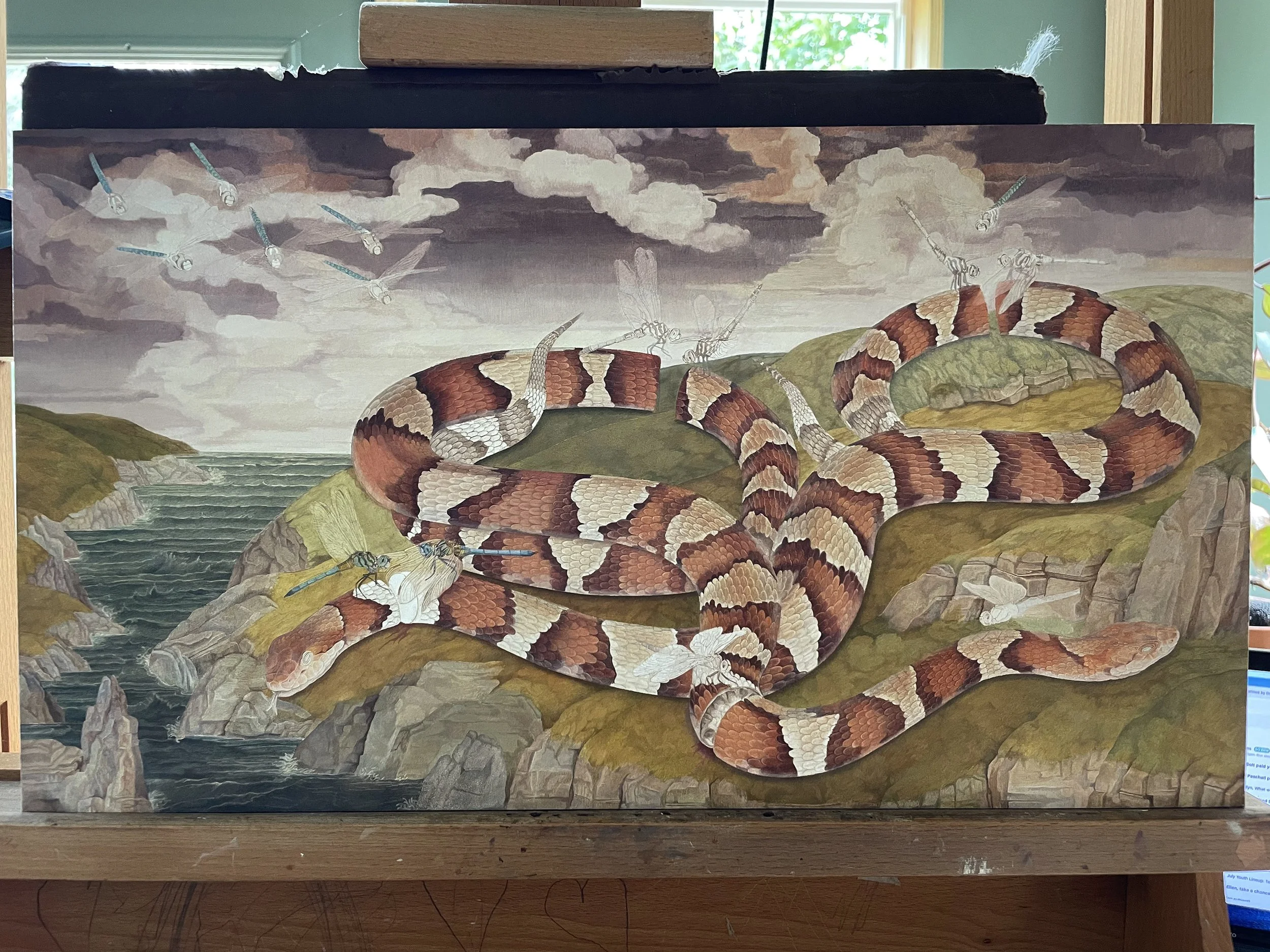 This is the first in a series exploring the intersection of human and insects vis a vis the folklore that has sprung up around them through the ages. This particular painting is 10x18 inches. In the south starting as far back as the 1800s there is evidence of people referring to dragonflies as “snake doctors.” This name came from the belief that dragonflies were in alliance with snakes and that they mended or repaired wounded snakes and restored them to their original vitality, particularly snakes who had been dismembered. Who knows what moment of magic between species the original source of this folklore witnessed, but I could not resist the opportunity to tackle this subject matter myself. In my version, 2 coiling copperheads caught in a moment of mating have been dismembered by a human and these dragonflies have descended in order to serve their purpose of stitching them back together. I have been practicing painting macro images of insect specimens for the better part of a year to get ready for this series. I hope I can distill the details of the 12 dragonflies in this painting and capture their shimmering, ethereal qualities, it will be a great challenge for me since that is not my forte. There will be a full landscape, sea and sky, so this one may take awhile.